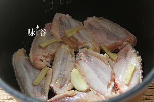 按下煮饭键,倒入适量油,放姜片,蒜,鸡翅皮朝下,盖盖煎煮一会。