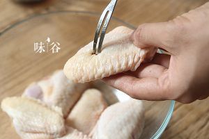 用叉子或者牙签在鸡翅表面戳一些小孔。