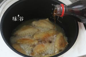 待鸡翅表面煎至金黄色,倒入可乐,没过鸡翅再倒入生抽就行,盖盖,跳键后再按一次煮饭键,收汁即可。(可乐和酱油的比例约为3:1)
