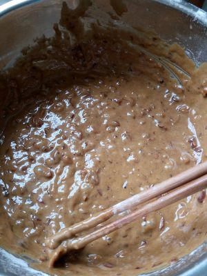 第三步,预热烤箱10分钟,150度上下火,同时鸡蛋打匀,加入红糖,搅拌均匀,注意不要有颗粒状,然后依次加入花生油,小苏打,面粉,从下往上翻匀。
