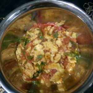 锅内倒少许油至熟,将打好的鸡蛋倒入锅内翻炒,表面没有蛋汁时关火放入碗中