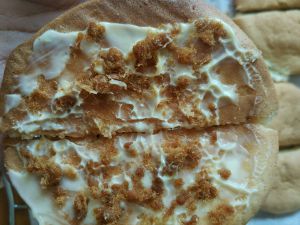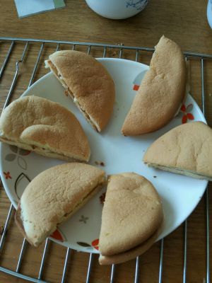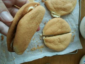 放入预热好180度的烤箱中,烤15分钟出炉,等完全冷却后将其从油纸上撕下,对切,尽量切成大小对称的两半