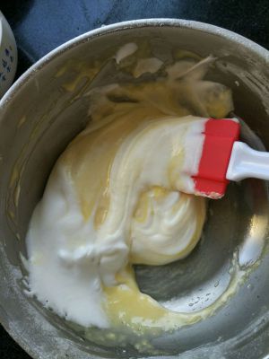 将三分之一的蛋白霜加入蛋黄糊中搅拌均匀