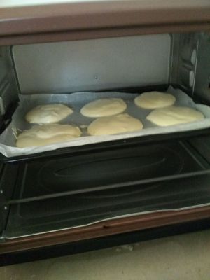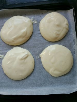 将做好的面糊用勺子打到铺好油纸的烤盘中,分成几个大小尽量相同的小圆饼