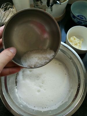 蛋清分2-3次加细砂糖,打发至硬性发泡