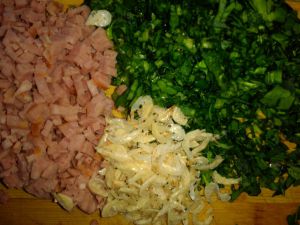 虾皮虾仁都可以,菠菜或者油菜,火腿肠