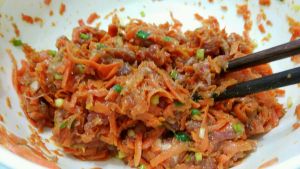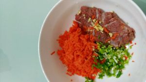 准备馅料。可以在发面前将胡萝卜用工具刨成条状,加盐腌制20分钟。这样,面和好后,正好可以挤出腌出的水分,再切碎调馅料。根据个人口味,加盐、胡椒粉、耗油、酱油、糖少许。用葱、花椒和拍好的蒜放油锅中,做好料油。将料油和馅料充分搅拌调匀。