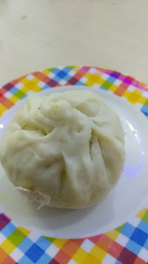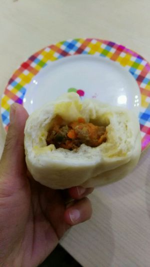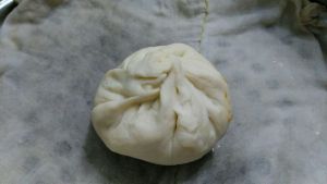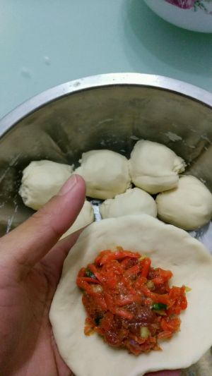面团捏成中间稍厚,边缘略薄的包子皮,装入馅料。