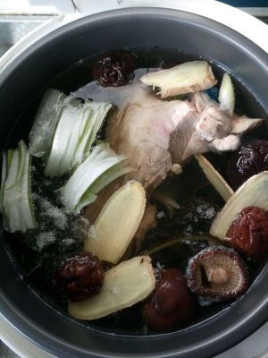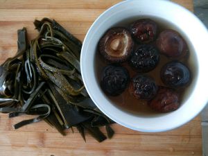 大骨头焯水的功夫也别闲着,取砂锅盛上水,凉水时放入切好的海带丝、香菇、姜片、葱段,大火烧开。注:海带凉水泡发,砂锅中水凉时就放海带,热水泡发,待砂锅中水热时才放海带。