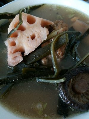 食材准备:大骨头洗净,干海带干香菇头一晚提前用冷水泡发,泡好的海带切成丝儿。注:香菇洗洗再泡,香菇泡的水和汤一起炖,使汤更香浓。