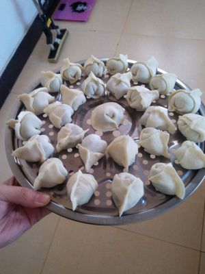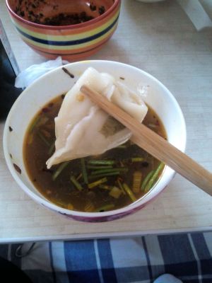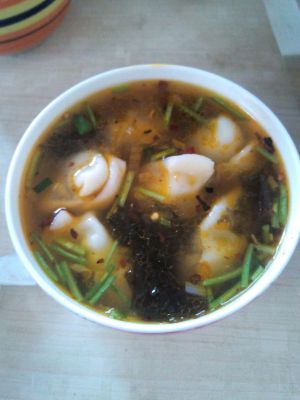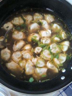 然后就是煮了,葱花爆锅,开锅下馄饨,放紫菜,盐,海鲜酱油,十三香,两开就好,然后放香菜,香油,鸡精,醋,红辣椒~