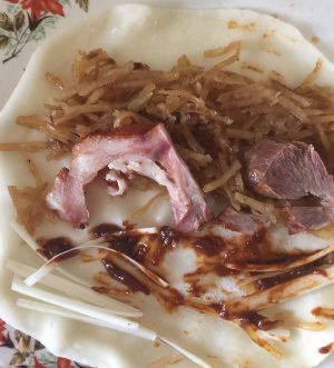 夹上肉丝,葱丝,土豆丝,各种你喜欢的酱,可以开始享受了