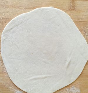 面板上放一层面粉,擀面时,不要一次太用力,擀的太长,会使面饼厚度不均匀,容易坏,擀一擀,就转90度,继续再擀,不能着急,面饼擀成直径15厘米左右。