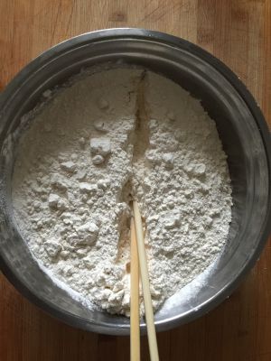 将面粉放盆里,中间分开,一半用凉水和,一半用开水烫面,然后将两侧面团和在一起,盖好,静置30分钟以上