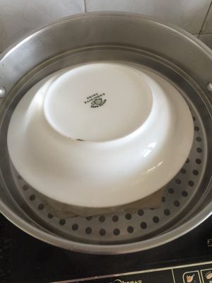 5分钟到了,开盖,将一个比饼大一号的盘子倒扣在饼上,翻转