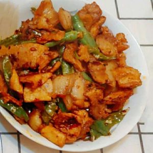 最后放入 煸的辣椒 炒4至5分钟即可 再放入少许盐鸡精 或者味精