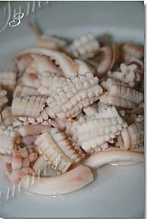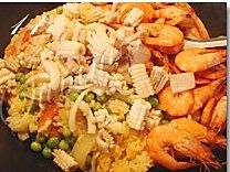再放入处理过我鱿鱼和虾,翻炒均匀,炒至水干米熟即可。
