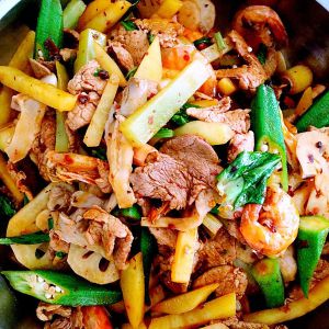 先放入肉类食材,翻炒均匀,再放入素菜,均匀翻炒片刻,食材入味后出锅。