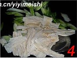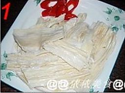 腐竹用冷水泡软,沥干水分;红椒切圈。