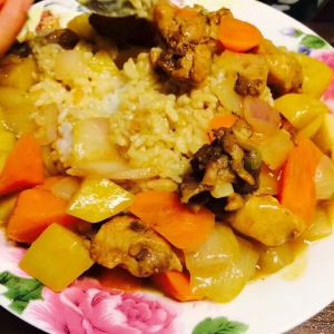 先用姜爆锅,放入鸡块炒至无水份,加水没过鸡块将鸡块炖熟,加土豆和胡萝卜,最后加洋葱和咖喱块,炖至所有材料软烂,收汤(不要太干)。盛饭开吃吧