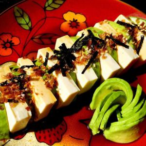 豆腐牛油果都切片,摆好,撒上香松或者芝麻,海苔碎,淋上生抽,可以开吃了。