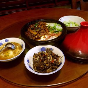 另一个灶就炒鱼香茄子(步骤省略),炒熟后,倒入塔吉锅一起焖。大概十分钟左右关火再焖一会儿就可以出锅吃了。