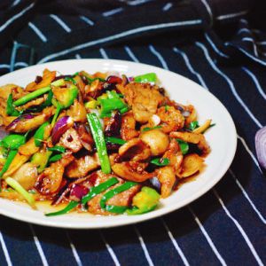最后放青蒜、洋葱、青椒翻炒断生,加少许盐、鸡精调味。