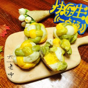 黄色面团,面粉150g:南瓜蒸熟以后碾成泥,2g酵母粉加温水溶解,倒入面粉,然后加入南瓜泥,按面团的软硬度决定放南瓜泥的多少,和成团