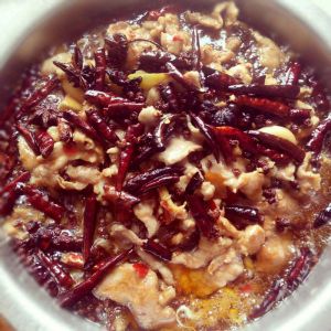 再次锅内放多油,烧热,放入辣椒,麻椒等至香味出,热油倒入肉片上
