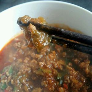 取肥瘦均匀五花肉,剁成肉糜,加少许料酒腌制,待锅中红油冒出,下肉糜。