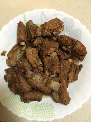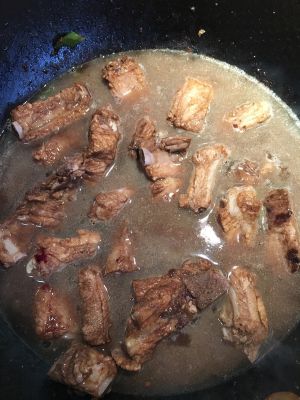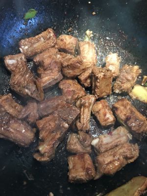 将排骨清洗干净用老抽,葱姜,料酒腌制一下。少油,姜片先下锅,煸炒片刻放入排骨。