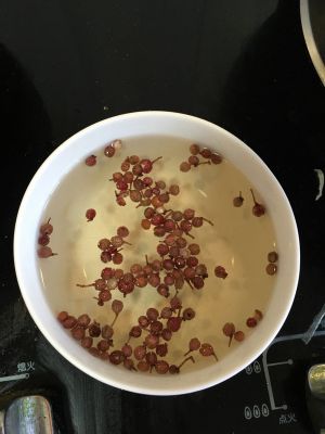热水泡花椒。将花椒水倒入锅中,并加入热水,没过排骨。大火煮开。