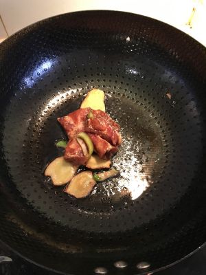 继续翻炒,加入一点老抽,继续炒直到肉收缩后。
