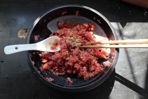 牛肉绞成馅,加入椰汁,酱油,白糖,葱花,蒜泥,香油,芝麻盐,胡椒粉,使劲朝一个方向搅上劲。(椰汁也可换成梨汁。看个人喜好)