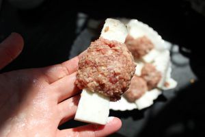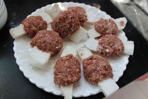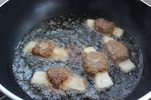 把搅打上劲的牛肉馅包在杏鲍菇的两面。捏紧了,使其更像排骨。
