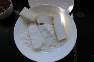杏鲍菇洗净,切厚片。大约为0.5CM左右。两面拍上淀粉。