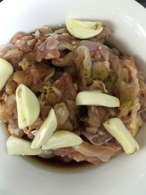 把鸡肉切块洗净,加蒜头,酱油、料酒、胡椒粉腌制一会。
