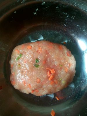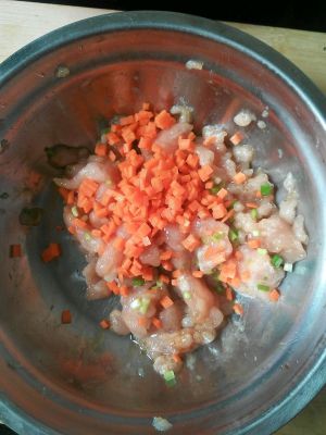 剁一点肉馅(因为只做一盘子,所以自己剁的肉,不会很累),和入盐,黑胡椒,胡萝卜碎,小葱碎,加一个蛋清,一点淀粉,充分搅拌,摔打一下