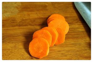日本豆腐切成块状,将切好的日本豆腐放在胡萝卜上