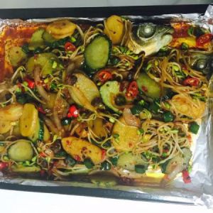 准备好配菜,差不多鱼烤到25分钟的时候可以炒配菜了,锅里放油放入豆瓣酱和蒜头,青红辣酱炒香,然后放入土豆片炒2分钟,在放入黄瓜片炒1分钟,最后放入黄豆芽调味后,炒至配菜5分熟后倒在烤鱼上,把鱼盖住,