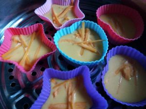 面糊入模具,大火把水烧开以后,再放上去蒸8分钟。