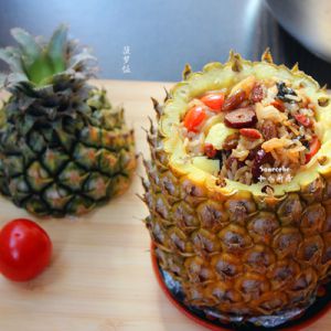 蒸好的米饭放凉捣散、圣女果洗干净切丁、葡萄干洗净、红枣片洗干净、枸杞洗净发泡、放红糖、海苔切碎一起拌均装入菠萝“碗”中;