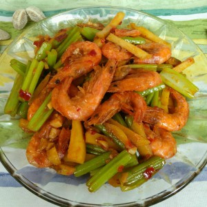 接着放入红椒、线椒碎、蒜粒、二小勺白糖煸炒片刻