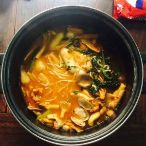 放入花蛤 茼蒿 菌菇等易熟食物煮2分钟