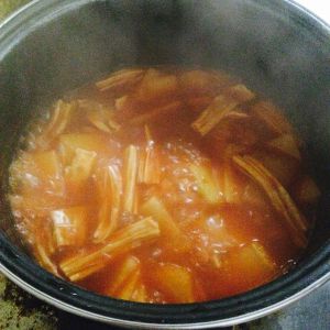 将冬瓜 鱼饼 腐竹 贡丸等放入泡菜底料煮3分钟