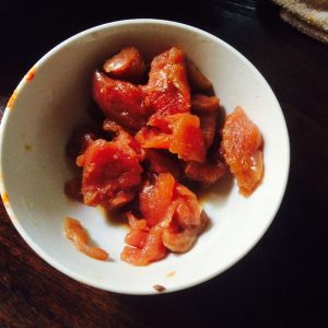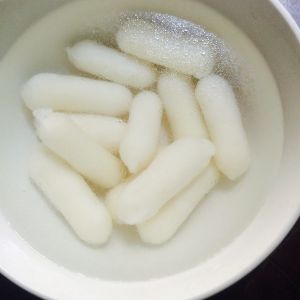 将芝士夹心年糕从冰箱拿出温水解冻直至变软(否则直接煮会开裂)