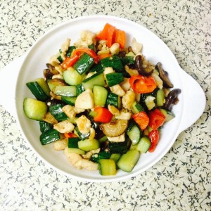 翻炒至5分钟样子将黄瓜丁倒入炒一分钟 随即倒入红彩椒