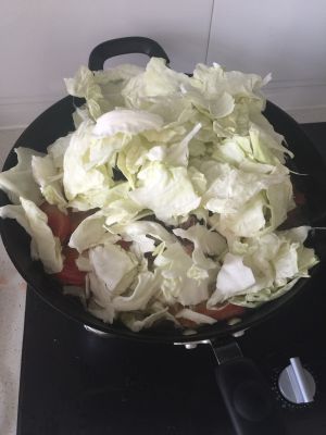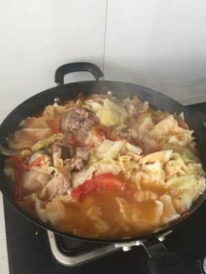 在骨汤里面加入西红柿和甘蓝,也可以放大头菜,继续煮。