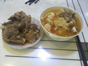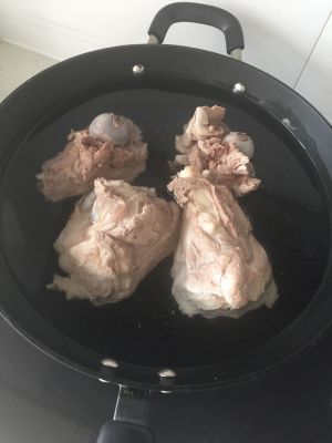 然后将大骨棒重新放入锅中加入冷水,生姜,大料,料酒,煮开后加入几滴白醋。煮开后转小火慢煮两个小时,然后加入适量的盐。