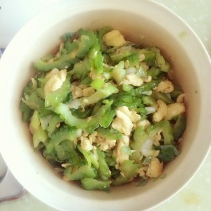 先放鸡蛋炒熟后,倒入苦瓜轻炒几分钟后便可以了,根据个人喜好放盐。